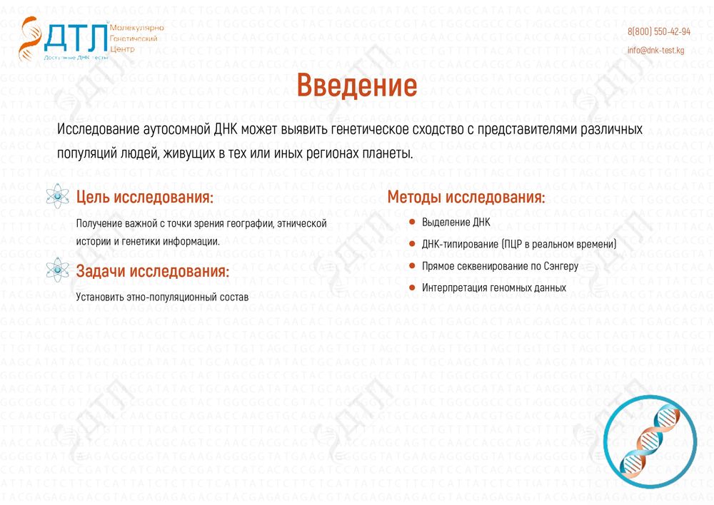 Для того чтобы установить национальность по ДНК в Бишкеке, исследуются аутосомные маркеры ядерной ДНК. Уникальные вариации этих участков ДНК позволяют определить, к каким нациям принадлежит человек и какая национальность является доминирующей.