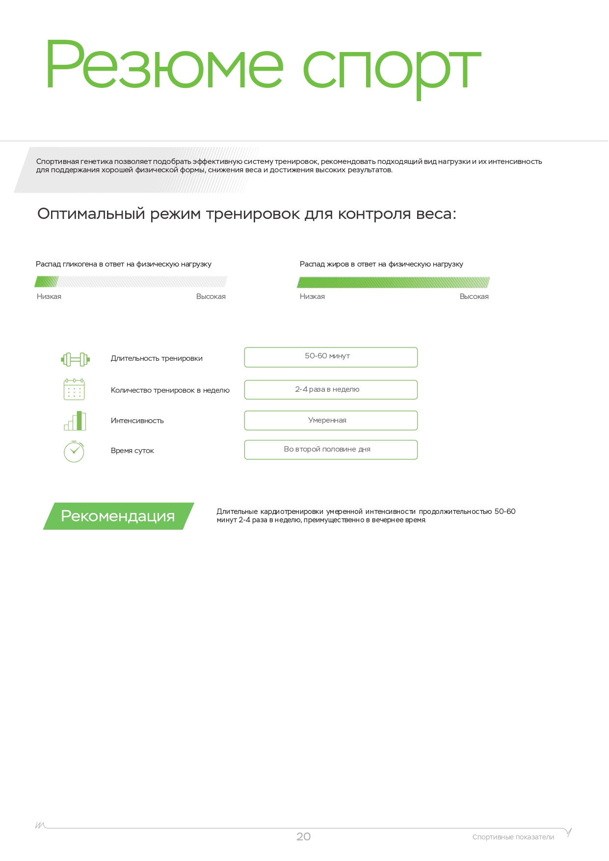 Этот генетический анализ на предрасположенность к спорту показывает, к каким видам спорта и физическим нагрузкам человек предрасположен генетически. Можно заниматься любыми видами спорта, но в одних дисциплинах достичь высоких результатов не получится, а в других, наоборот, можно стать атлетом мирового уровня быстрее остальных и с меньшими усилиями. Поэтому мы рекомендуем пройти наш ДНК тест предрасположенность к спорту в Бишкеке. Помните, что, помимо физических нагрузок, большую роль играет питание.