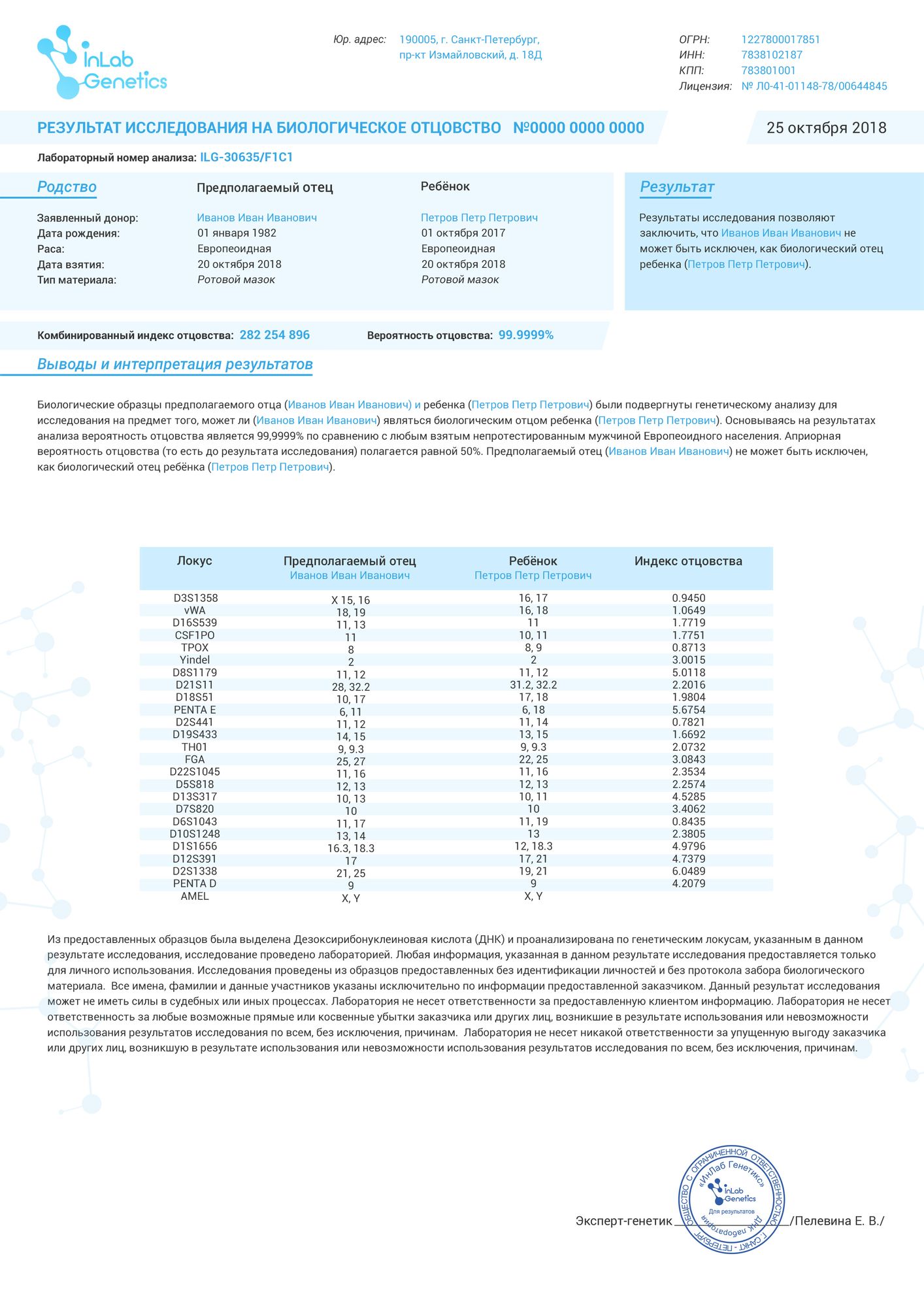 Для досудебного установления отцовства, Вы можете провести досудебную генетическую экспертизу на отцовство. На данный момент — это самый точный метод из всех существующих. Точность этого метода достигает 99,999999%.