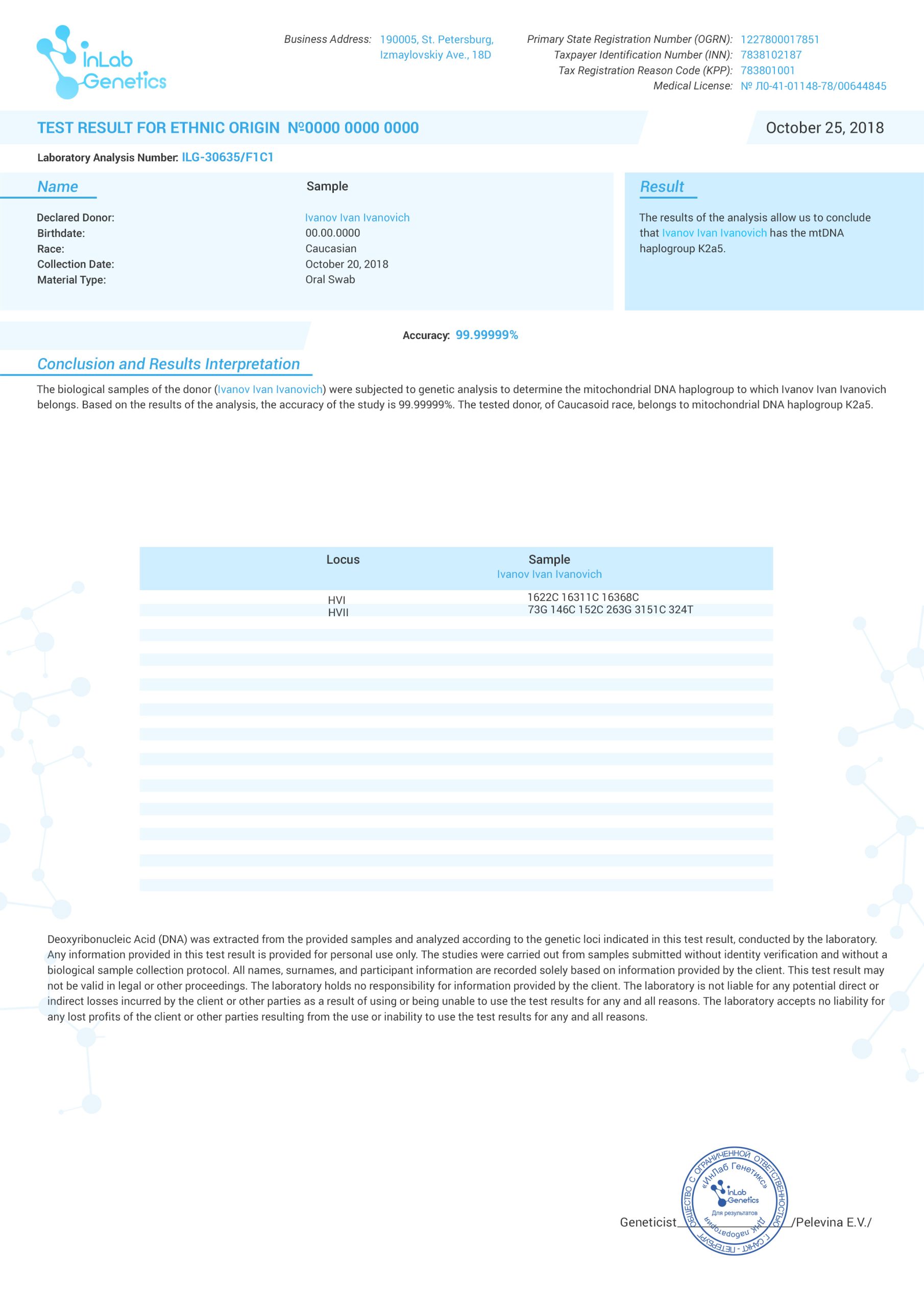Each order is assigned a unique individual number. The laboratory guarantees 100% safety and confidentiality of all data received from you.