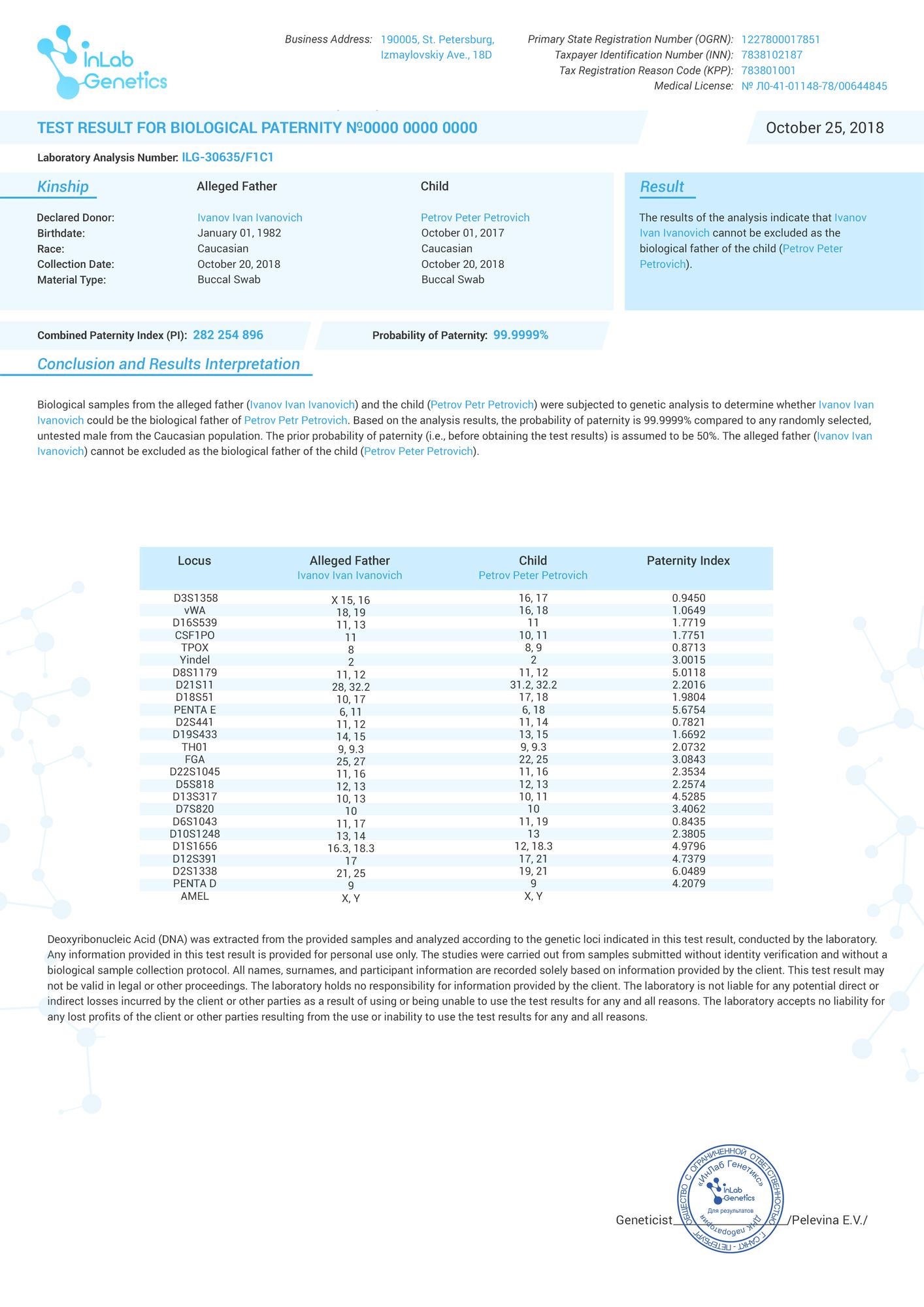 As a result of the genetic examination, a full expert opinion report will be prepared. This is a multi-page stitched document containing all the information necessary for the court, which is certified by the seal of the laboratory and the signature of an expert geneticist. Make a pre-trial paternity test and get a legal document for submission to the court.