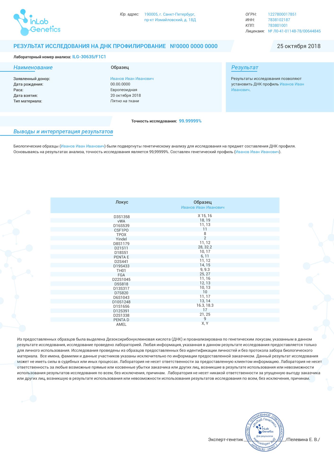 Генетикалык паспортту манжа изи менен салыштырууга болот; ал эч качан башка эч кимдикине дал келбейт. ДНК паспортунда жазылган маалымат универсалдуу жана эл аралык болуп саналат; бул документти дүйнөнүн каалаган жеринде каалаган генетик оңой окуй алат. Төмөндө бул бетте үлгү ДНК профилин таба аласыз.