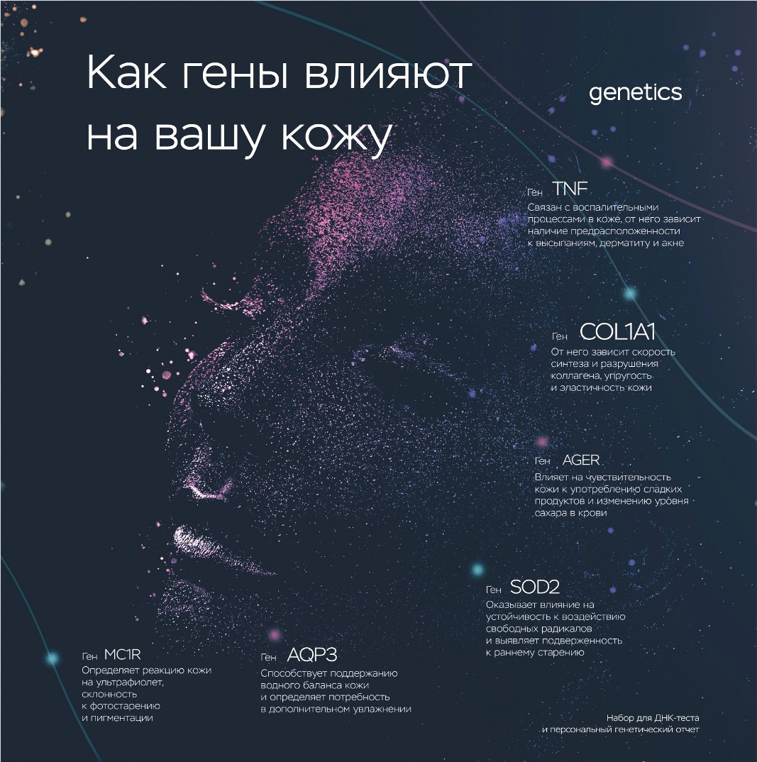 Биздин молекулярдык-генетикалык борбор «ДТЛ»дүн адистешүүсү — бардык түрдөгү ДНК анализдери. Биз көп сандагы изилдөөлөрдү жүргүзөбүз, алардын ичинен эң белгилүүсү — сулуулук жана жаштык үчүн ДНК-тест. Бул — тери кароосунун генетикасы. Бул тест сиздин организмиңиздин өзгөчөлүктөрүн көрсөтөт жана жашка байланыштуу өзгөрүүлөрдү алдын ала айтууга мүмкүнчүлүк берет. Анализ керектүү косметикалык каражаттарды жана процедураларды жеке тандоого жардам берет, ошондой эле витаминдерге болгон муктаждыкты көрсөтөт. Анткени туура эмес тандалган косметика териңиздин жана чачыңыздын абалына зыян келтириши мүмкүн.