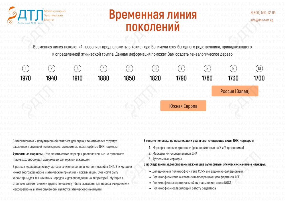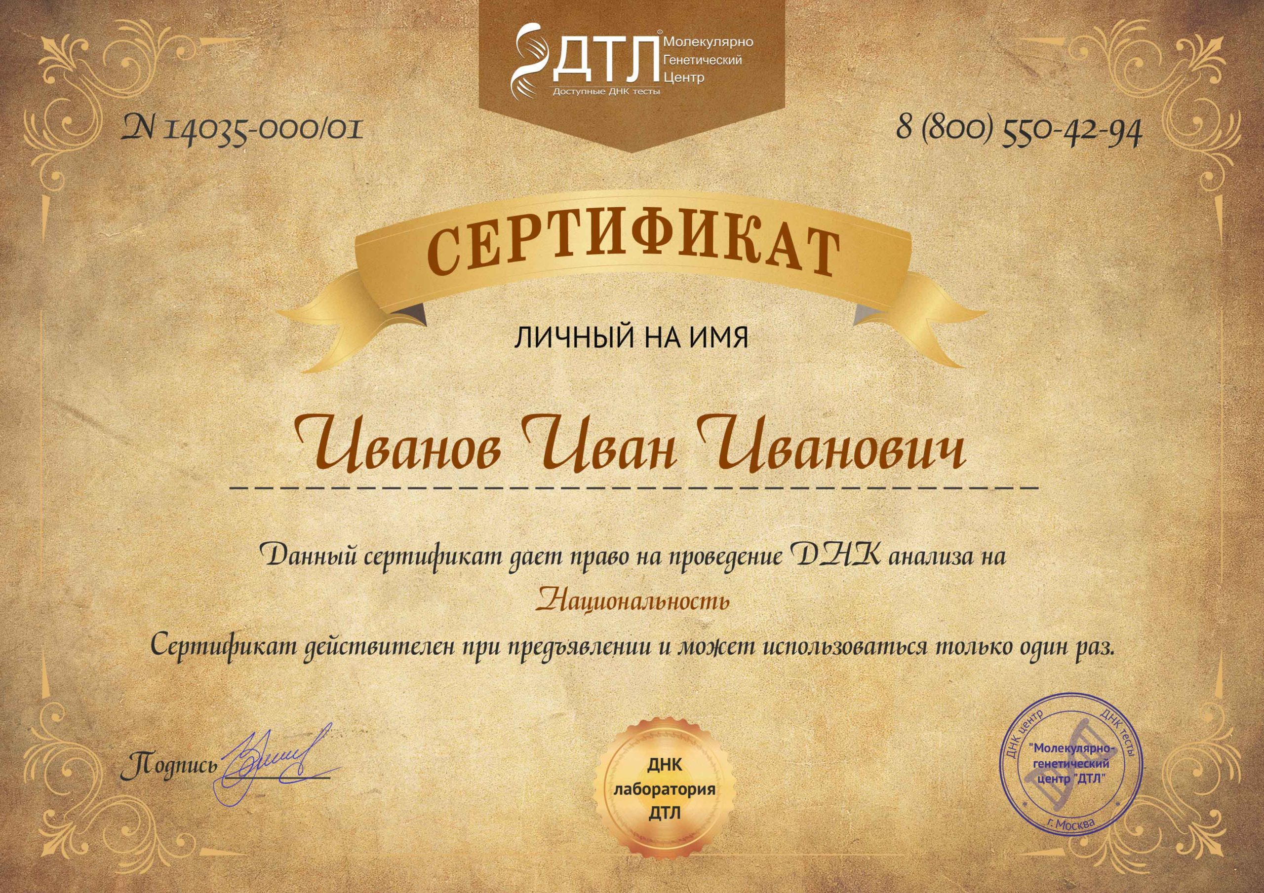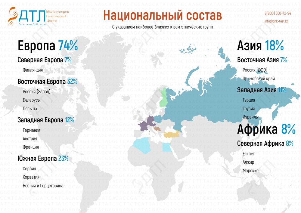 Биздин ДНК борбору, DTL, сиз улуту боюнча ДНК тест тапшыра аласыз. Бул ДНК теги тести сиздин генеалогиялык тамырыңызды түзүүгө жана үй-бүлөңүздөгү улуттарды табууга жардам берет. Балким, сенин ата-бабаларыңда еврейлер, карелдер, осетиндер, молдовандар, чечендер, белорустар жана башка көптөгөн элдер болгондур. Бул улуттун ДНК тести сизге ата-тегиңизди жакшыраак түшүнүүгө, үй-бүлөңүздүн келип чыгышын табууга жана архивдерге жана китепканаларга узак сапарларга убакыт коротпостон үй-бүлө дарагын түзүүгө жардам берет.