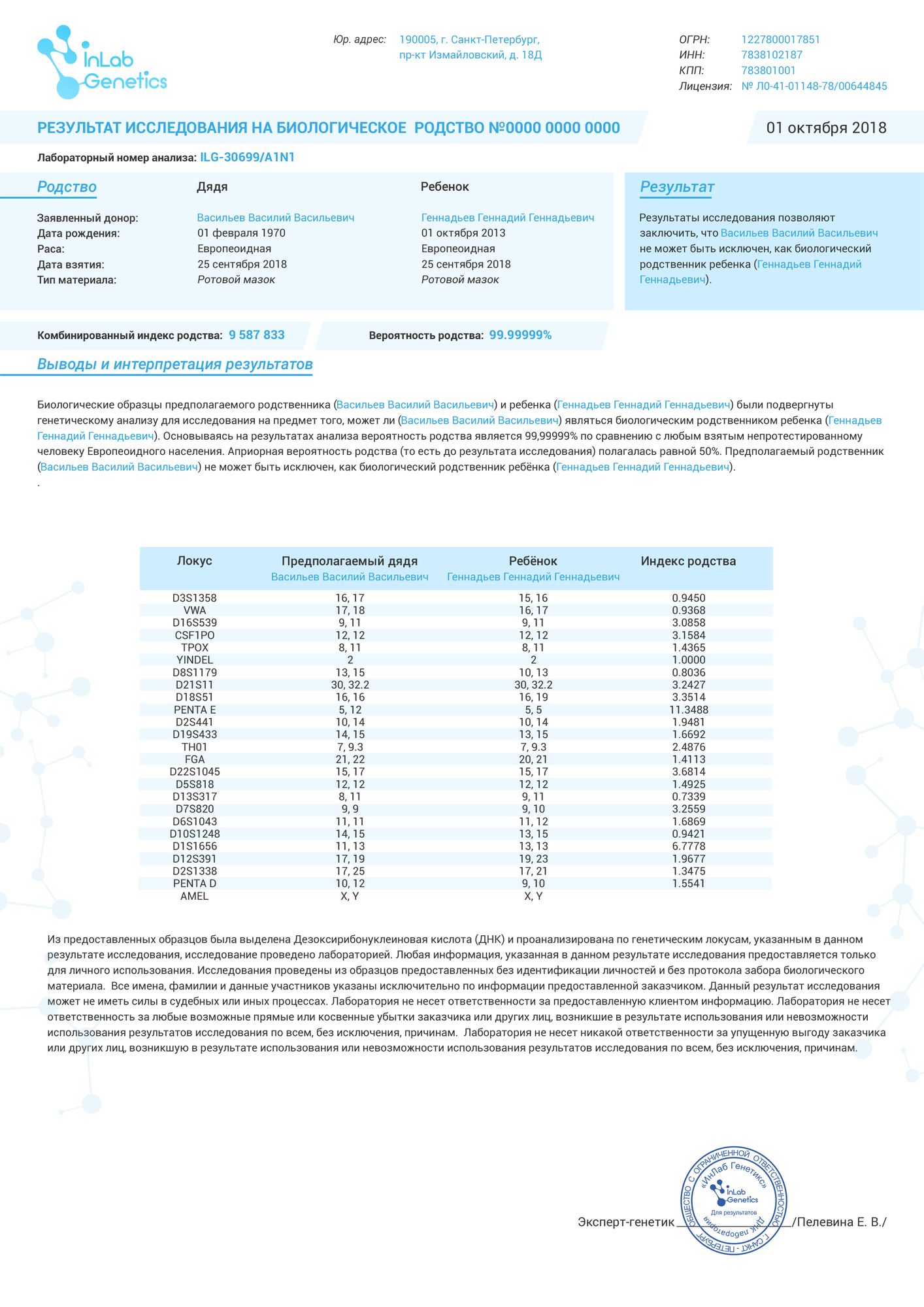 Лаборатория толук аккредиттелген жана сертификацияланган. Отчеттор ар тараптуу жана деталдуу. ДНК-генетикалык тестирлөө юридикалык талаш-тартыштарда негизги далил болуп жатат жана бардык соттор жана мамлекеттик органдар тарабынан кабыл алынат.