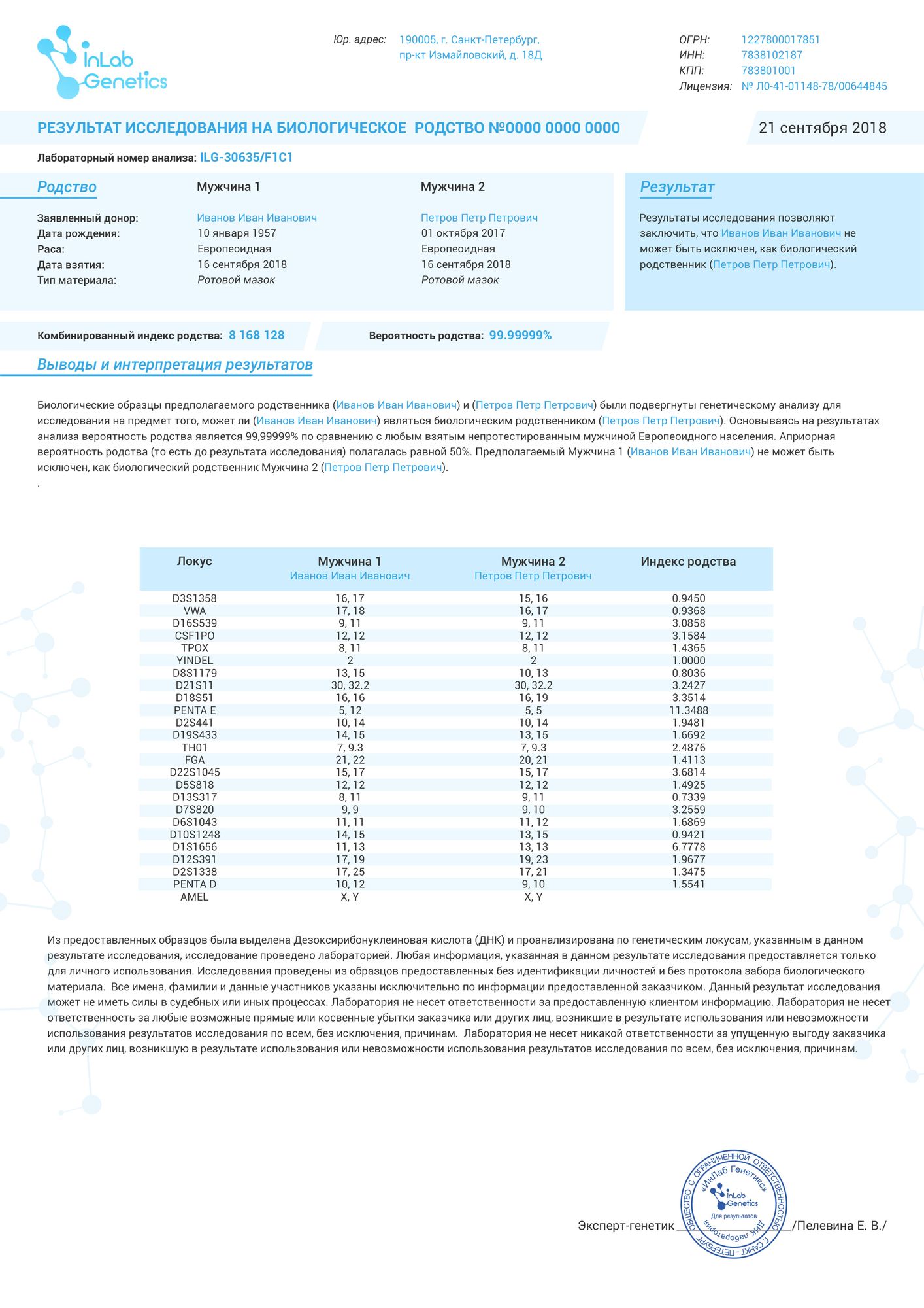 Бул хромосома адамдан адамга бүт аталык линия боюнча өтөт жана дээрлик эч кандай өзгөрүүгө дуушар болбойт, ал тургай эң алыскы туугандардын арасында да тууганчылыкты аныктоого мүмкүндүк берет. Бул ыкма аталыкты тастыктоодо 99,999999% так. Эркек линиясында ДНК анализинин жыйынтыктарынын абсолюттук тактыгын камсыз кылуу үчүн лаборатория адистердин ар кандай топтору тарабынан эки параллелдүү анализ жүргүзөт. Андан кийин натыйжалар лабораториянын жетекчисинин колу жана мөөрү менен күбөлөндүрүлөт.